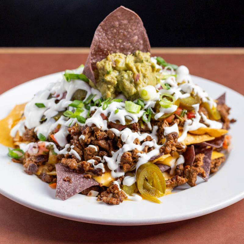 Flank steak, cheese, jalapeños, sour cream, pico de gallo, guacamole, and salsa.